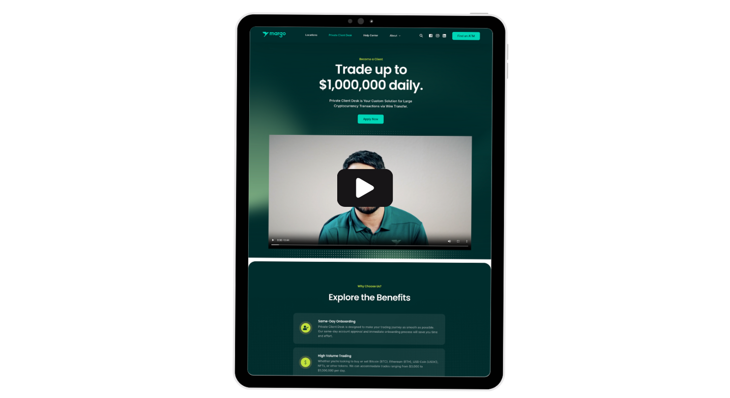 Margo is a fintech startup specializing in Bitcoin ATMs and digital asset solutions, positioning itself as a leader in cryptocurrency accessibility. The company's core offering began with a nationwide Bitcoin ATM network, which expanded to include a Private Client Desk serving high-net-worth individuals and institutional investors, plus an online purchasing platform enabling instant digital asset acquisition.